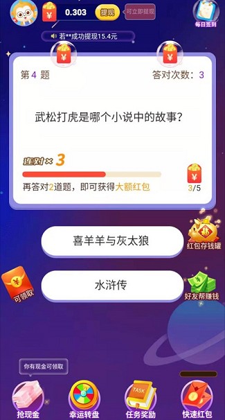 这是一款专为手机用户设计的答题赚钱游戏,游戏题目以常识性内容为主,难度适中但趣味十足。最大的亮点在于它的答题赚红包机制,让你在享受知识竞赛的同时还能获得实实在在的现金收益。游戏采用答题闯关模式,每完成一个关卡都能获得红包奖励。如果你想获得更多收益,还可以选择观看广告来使红包金额翻倍。需要注意的是,在领取红包奖励时需要观看简短的视频广告,这是保证后续提现功能正常使用的必要条件。