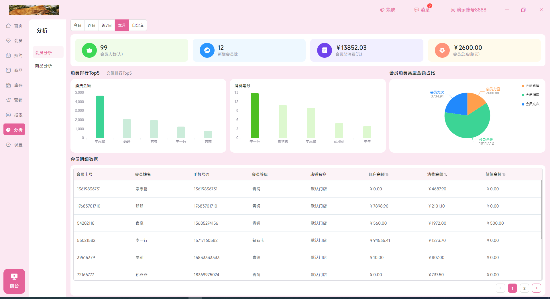 【数据报表】:数据报表多维度呈现,涵盖销售业绩、员工提成、会员分析、商品分析等关键数据,可视化图表助力门店经营决策,挖掘潜在商机。系统支持自定义报表功能,商家可根据实际需求设置专属分析维度,全面掌握门店经营状况。