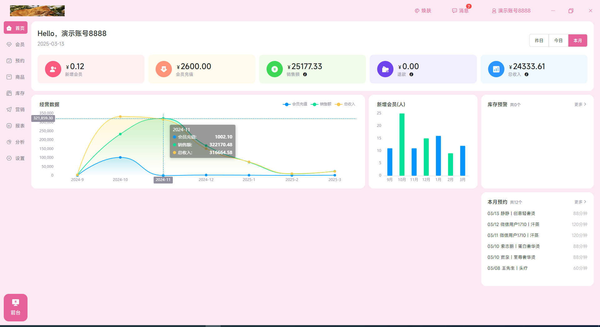 【客勤管理】:系统依据客户消费周期、项目偏好自动生成待分配、待回访、邀约等客勤任务。触达客户,提升客户粘性与忠诚度。系统支持订单查询、快速计次充次,寄存、兑换、核销、硬件等设置。同时提供客户满意度调查功能,收集客户反馈,持续优化服务质量,建立长期稳定的客户关系。