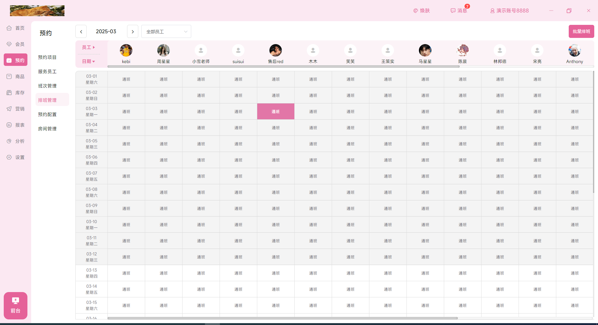 【排班管理】:告别传统纸质排班,设置好班次,可批量设置员工班次,也可以单独针对员工休假或店内活动合理安排调整员工班次。可通过排班看板查看员工班次。系统还支持员工考勤打卡、工时统计等功能,自动计算员工薪资,大幅减轻人事管理工作量,让排班管理更加科学合理。