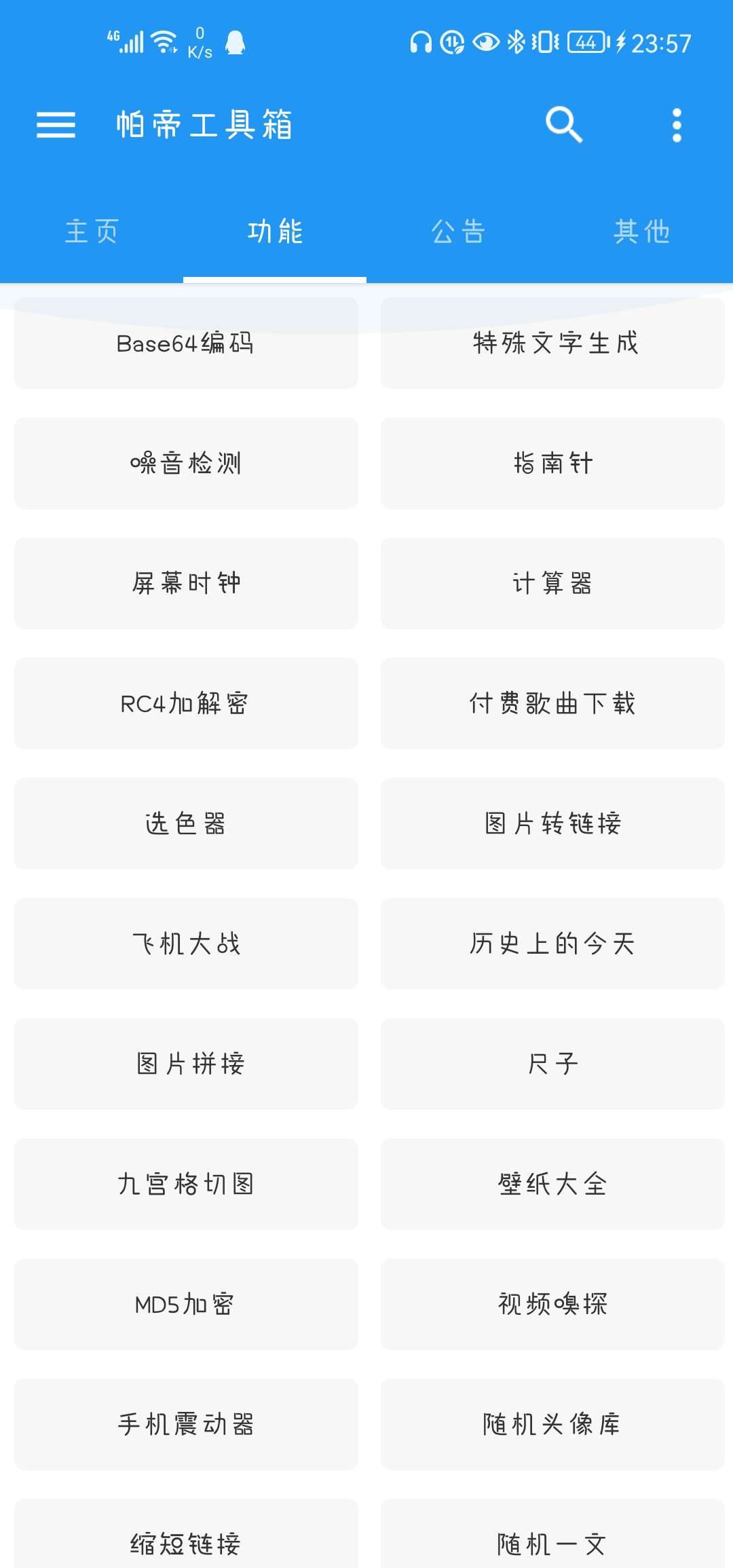 帕帝工具箱是一款功能强大的安卓端实用工具合集,为用户提供一站式解决方案。它集成了49个精心设计的小工具,涵盖日常生活、娱乐休闲、办公学习等多个场景。从基础的指南针、直尺到高级的图片拼接、资源嗅探,再到趣味性的表白图片生成、飞机大战游戏,这款工具箱都能轻松应对。其简洁直观的界面设计和完全免费的使用策略,让每位用户都能快速上手,享受科技带来的便利。无论是学生、上班族还是技术爱好者,都能在这里找到适合自己的实用功能。
