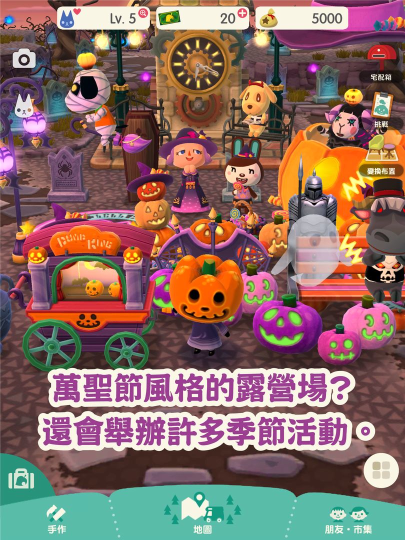 游戏提供了超高的自定义自由度,除了露营场地外,玩家还可以按照个人喜好设计露营车和小木屋的内部装潢。每逢万圣节、圣诞节、复活节等重大节日,游戏都会推出应景的限定活动,玩家可以通过参与活动获取独特的节日装饰品。
