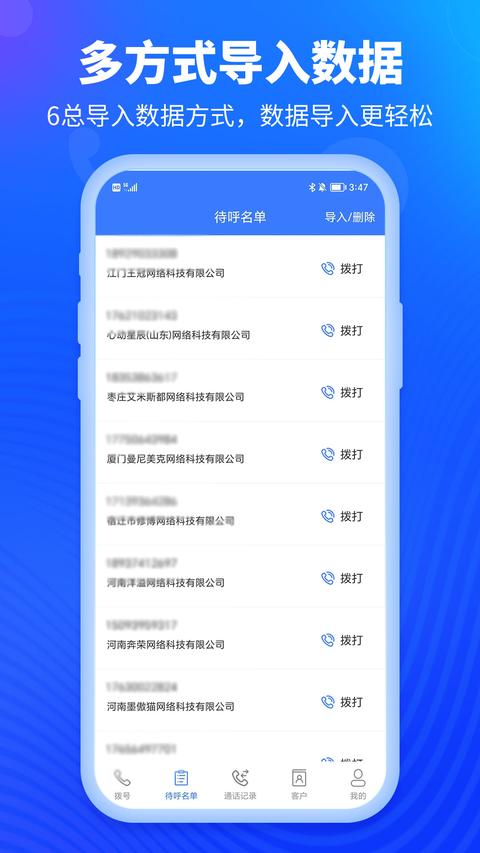 电销外呼系统app是一款专为电话销售团队设计的智能化管理工具,它不仅拥有简洁直观的用户界面,还集成了多项实用功能,能够显著提升电销人员的工作效率。该应用支持多种方式的客户号码导入,无论是从Excel表格批量导入还是手动添加,都能轻松完成。强大的客户管理系统让您能够快速查找、分类和管理客户信息,同时支持为不同客户添加个性化标签和业务提醒,确保重要事项不会被遗漏。此外,系统还提供详细的数据报表统计功能,帮助您清晰掌握销售业绩和客户跟进情况。如果您正在寻找一款高效便捷的电销管理软件,电销外呼系统app绝对是您的最佳选择,快来下载体验吧!