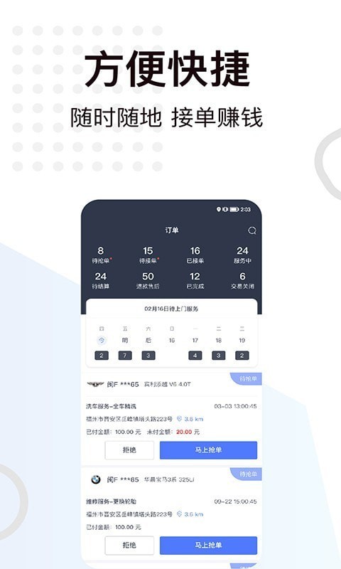 消息中心整合所有订单任务和动态信息,用户可快速查阅最新业务进展。智能订单筛选系统会根据用户偏好和历史数据,自动推荐最适合的优质订单。采用全上门服务模式,用户只需在APP上简单操作,就能享受从车辆保养到紧急救援等各类专业服务。