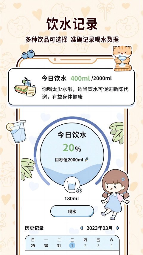 有自动提醒功能,到喝水时间能够提醒用户进行喝水,让你的身体达到足够的水分。用户可自定义提醒频率和时间,确保每日饮水量达标。