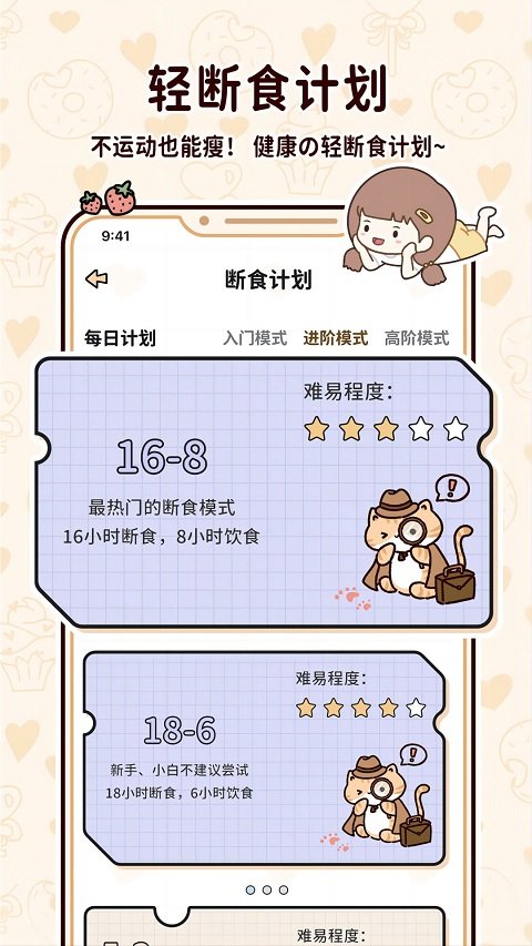 专门为需要减肥的用户的禁食计划;提供多种禁食模式选择,如16:8轻断食、5:2轻断食等,满足不同用户的需求。