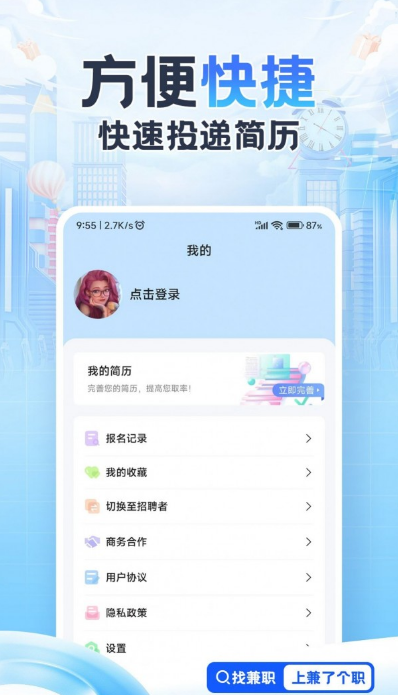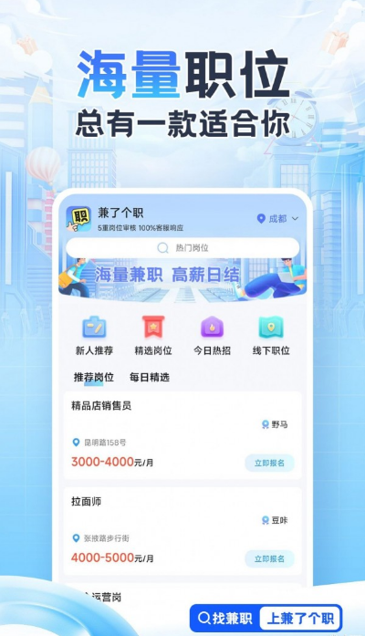 兼了个职app是一款专为成年人设计的兼职求职平台,致力于为年满18岁的用户提供丰富多样的工作机会。在这里,你可以找到涵盖各行各业的兼职岗位,无论是体力劳动还是脑力工作,都能获得可观的收入回报。平台严格限制未成年人使用,鼓励年轻用户专注于学业和成长。通过简洁直观的界面和智能匹配系统,用户可以轻松筛选适合自己的兼职,开启灵活就业的新模式。