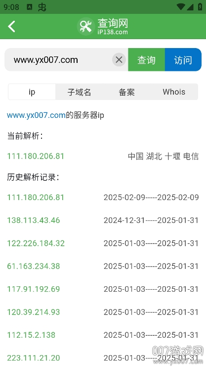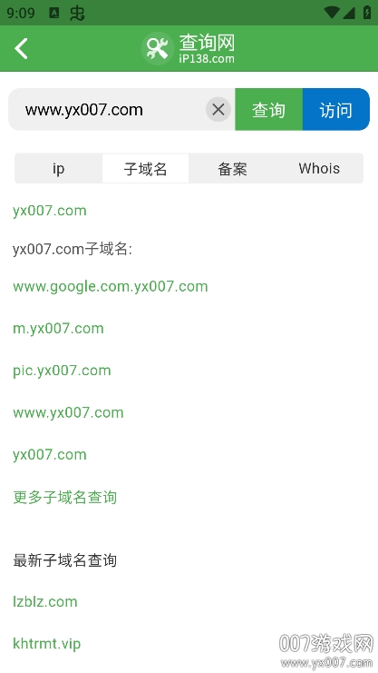 打开软件后,在搜索框中输入需要查询的IP地址或域名,系统会自动进行智能识别。查询完成后,软件会立即显示详细的查询结果,包括IP归属地、运营商等信息。点击备案按钮可以查看该网站完整的备案信息,包括备案主体和备案号等关键数据。通过子域名查询功能,用户可以了解目标网站下的所有子域名分布情况。最后点击访问按钮,就能直接跳转到查询结果的网页,实现快速访问。