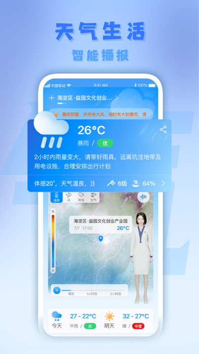全新推出天气实景分享功能,用户可以通过拍摄或上传照片的方式直观展示各地天气状况,还能添加创意滤镜和天气标签,变身专业天气播报员。优化了核心交互体验,上下滑动操作更加流畅顺滑,让天气预报、天气趋势、风速变化等信息的查看更加高效便捷。重磅上线可视化气象云图系统,支持降水、气压、湿度、风力、风向等10余种气象要素的全国范围动态展示。升级智能提醒引擎,融合人工智能算法,可精准预测每日温度变化、跨城温差、雾霾扩散等复杂气象情况,配合直观的图表展示,让天气信息一目了然。