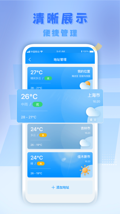 极致便捷的操作体验:采用符合人体工程学的上下滑动交互设计,让用户能够快速浏览天气趋势、风速变化和生活指数等关键信息。视觉享受的界面设计:精选百万张高清城市景观和自然风光作为背景,根据实时天气自动切换主题风格,打造沉浸式天气浏览体验。革命性的天气雷达功能:提供分钟级降水预报,精准预测未来2小时内是否下雨及降水量大小,彻底解决出门带伞的困扰。智能化的提醒服务:基于用户位置和行程安排,主动推送天气变化提醒,包括温度骤变、空气质量恶化等重要信息。