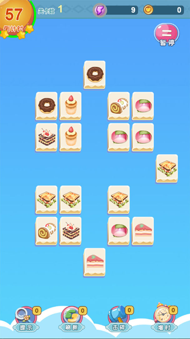 游戏开始时玩家可以从多个主题关卡中选择挑战目标,每个关卡都有独特的美食图案组合。核心玩法延续经典连连看规则,需要连接两个相同且路径通畅的图案进行消除。特别的是游戏引入了宠物辅助系统,玩家可以培养自己的猫咪伙伴,它们会帮助寻找可消除的图案或提供特殊技能,为游戏增添策略性。