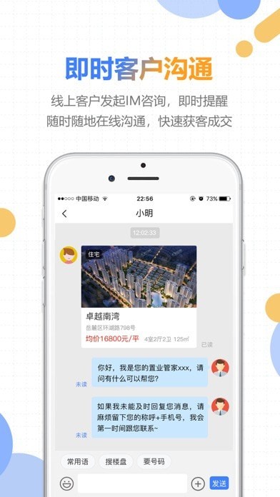 支持经纪人与客户在线即时沟通,快速搞定客户。内置丰富的房产资料库,一键发送楼盘信息、户型图等专业资料,提升沟通效率。