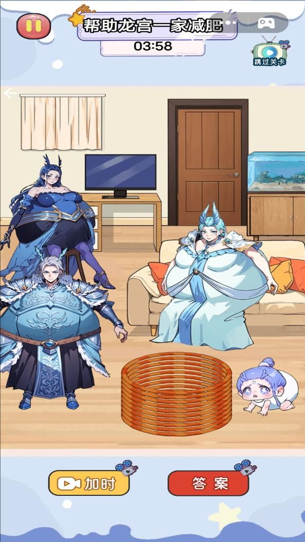 游戏采用关卡制推进模式,每个关卡都有特定的减肥目标需要完成。玩家可以从丰富的道具库中选择合适的工具,比如运动器材、健康食谱或神奇魔法道具。通过拖拽道具与角色互动,观察他们的反应来调整策略。游戏设有时间限制和道具使用次数限制,增加了挑战性。成功完成关卡会解锁新道具和新角色,还能收集星星奖励用于升级道具效果。随着游戏深入,关卡难度会逐步提升,需要玩家发挥创意组合使用道具。