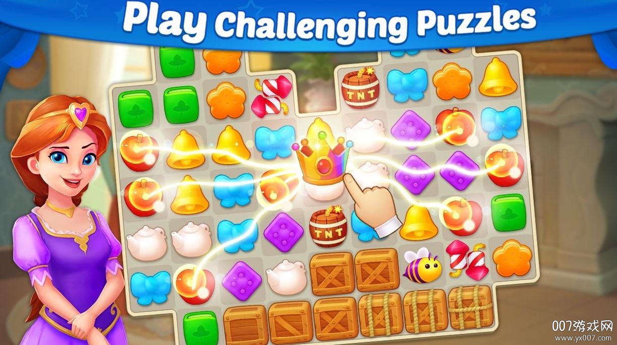 《城堡故事中文最新版》是一款融合消除玩法与城堡装饰的休闲益智游戏。在这个充满魔法的童话世界里,玩家将化身爱丽丝的得力助手,通过完成消除挑战来收集资源,逐步修复被破坏的Moonbright城堡。游戏采用清新明快的卡通风格,搭配轻松愉悦的背景音乐,为玩家营造出沉浸式的游戏体验。超过上百个精心设计的消除关卡,搭配多样化的装饰元素,让你在享受消除乐趣的同时,还能发挥创意打造独一无二的梦幻城堡。