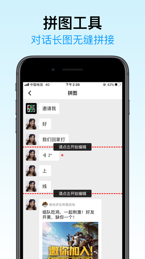 【拼图功能】多种拼图模式满足不同需求,即使是超长对话截图也能完美拼接。