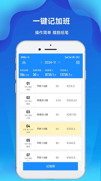 记加班工时记APP是专为现代上班族打造的智能工时管理工具,它能帮助用户轻松记录每日工作时间、加班时长,并自动计算应得报酬,让繁琐的考勤统计变得简单高效。这款应用采用人性化设计,界面简洁明了,操作流程直观易懂,即使是初次使用的用户也能快速上手。无论是记录日常考勤还是管理复杂加班情况,记加班工时记都能提供专业可靠的解决方案。