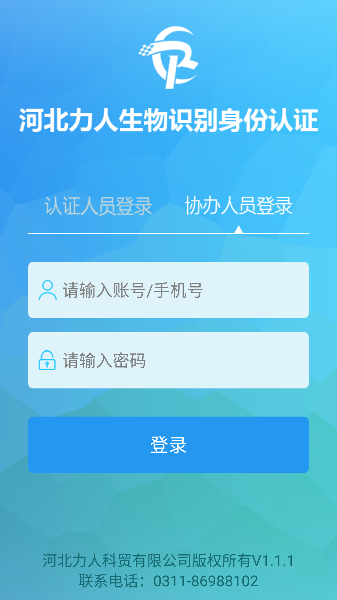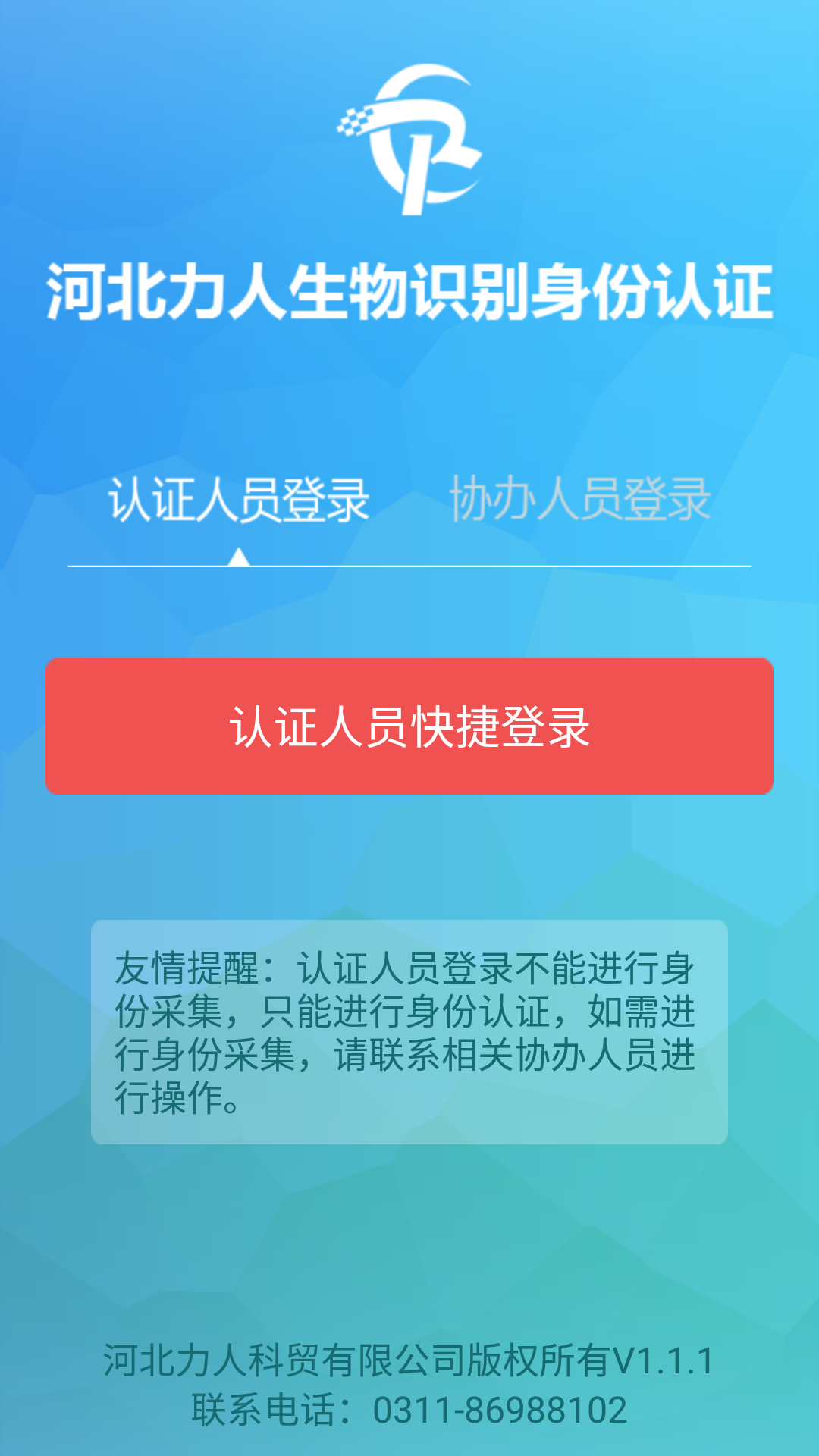 河北力人识别软件使用教程:首次使用需完成实名注册,通过身份证信息和人脸识别双重验证。日常使用时可直接快捷登录,点击身份认证按钮进入操作界面。