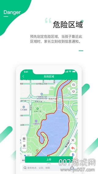 在后台可以限制危险区域,预先划定危险区域,当孩子靠近词区域的时候;系统支持自定义危险区域设置,覆盖学校、网吧等常见场所。