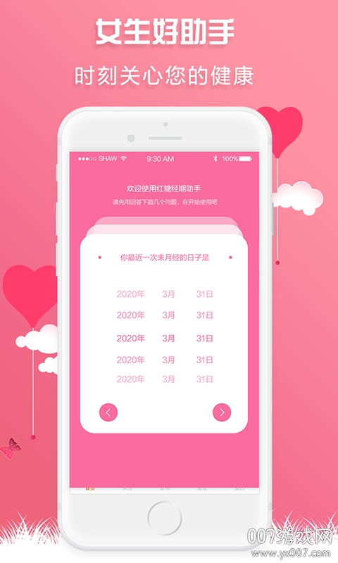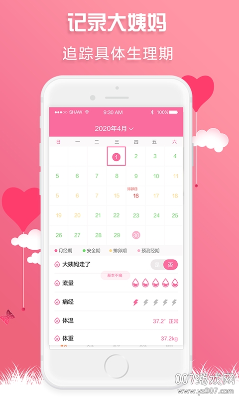 【经期助手】根据以往经期日期记录,智能推算你的经期、生理期和排卵期,准确率高达95%以上。系统会自动学习用户的周期规律,预测结果会随着使用时间的增加而越来越精准。