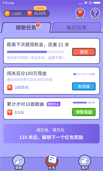 完成更多猜歌任务,获取全新红包奖励。游戏采用智能推荐系统,会根据你的音乐偏好推送适合的歌曲,让你在熟悉的旋律中轻松赚钱。每日更新海量曲库,涵盖华语、欧美、日韩等各类流行音乐,满足不同用户的听歌需求。
