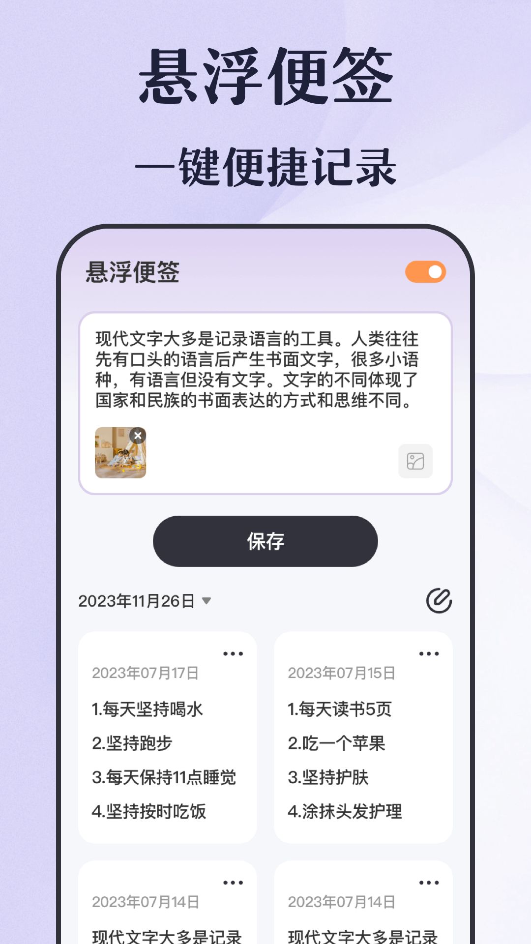 倒计时设置:支持自定义倒计时时间,可以精确到秒设置提醒,还能添加详细的备注信息,提醒即将到来的重要日子。主题更换:提供多种主题风格,每周还会更新节日限定主题,根据个人喜好轻松切换,让你的手机桌面常换常新。悬浮便签:采用创新的可随意拖动和放置的悬浮窗口设计,支持多种字体颜色和背景选择,方便快速记录灵感、待办事项等重要信息。
