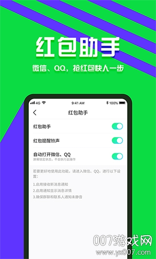 红包助手:贴心设计红包提醒功能,支持微信、QQ等主流社交平台的红包通知,但坚持不自动抢红包的原则,充分尊重用户隐私,绝不获取任何个人信息。