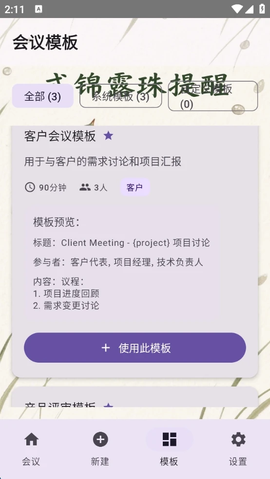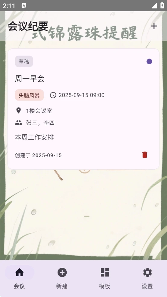 式锦露珠提醒是一款好用的会议纪要工具,用户可以自由编辑各类形式的会议纪要,也可以直接使用内置的各类模版编辑,快来试试吧。