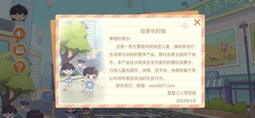 星星生活乐园游戏主要针对学龄前自闭症儿童群体开发,其特色在于将丰富的剧情通过文字和图片的互动模式生动展现。游戏中的每个场景都经过专业团队精心设计,为孩子们提供准确的社会信息和实用的社交提示,系统性地增强他们对各种社会情境的理解能力。游戏界面简洁友好,操作方式符合儿童认知特点,让特殊儿童也能轻松上手,在游戏中获得成长。