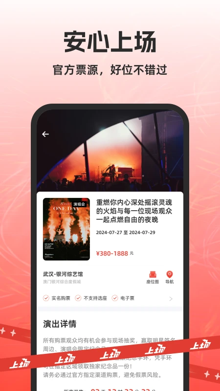上场APP是一款颠覆传统的演出购票平台,它不仅提供便捷的购票服务,更让用户从旁观者转变为演出活动的直接参与者。平台汇聚了全国各地的精彩演出资源,包括演唱会、音乐节、Livehouse、脱口秀和动漫展览等丰富内容。通过严格的票源审核机制,确保每位用户都能获得真实可靠的官方票务。独特的票根收藏功能让每场演出都成为值得珍藏的回忆,而实时更新的演出资讯则让你永远快人一步掌握最新动态。现在就加入上场APP,开启你的沉浸式观演体验!