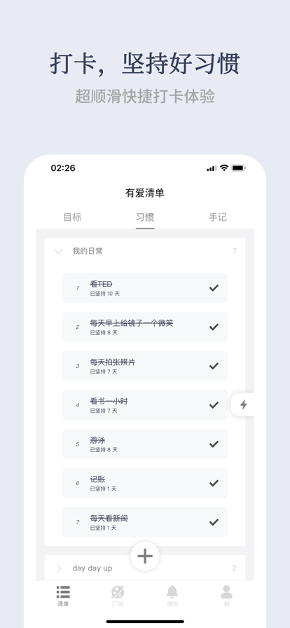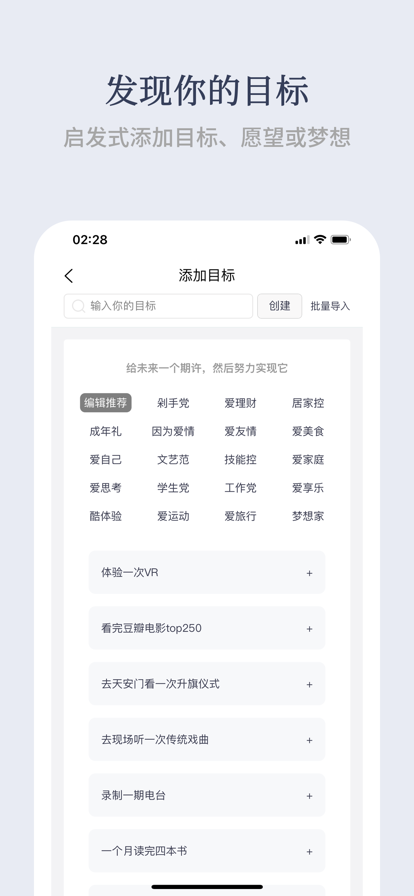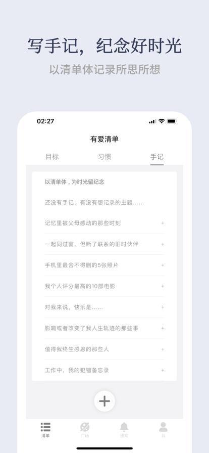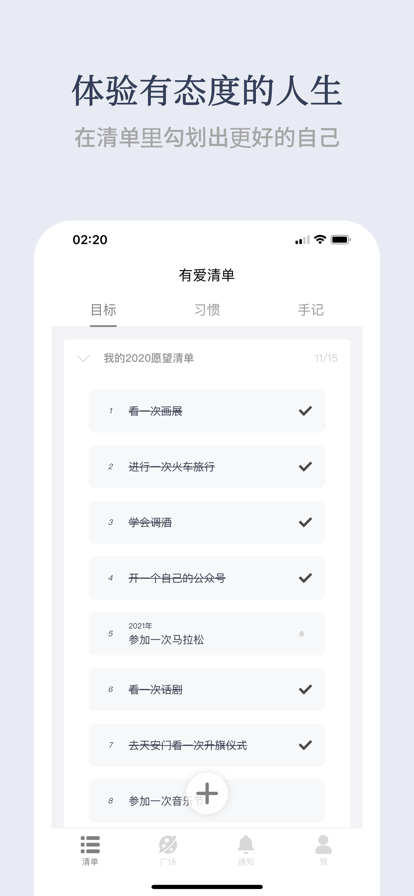 【目标/愿望/梦想】·有质量的生活其实很简单——有人爱,有事做,有所期待;·在有爱清单,有许多示例可以激发你对美好生活的灵感,比如:·在世界之巅看一次日出日落;·坐热气球环游城市;·吃遍米其林排行榜上的餐厅·和好朋友一起环球旅行·看完100本书·开一个自己的公众号·学会一门第二外语·做一本自己的犯错备忘录·在阳台种满花·拥有一个大大的衣帽间·……·你可以为自己规划完成的时间,还可以在目标下记录过程中的动态,无论是小心情、小宣泄或是小进步——当到达终点时,回望自己一路走过的足迹,定是一幅美不胜收的风景。·当勾掉越来越多清单里的目标,你也一定会在越来越多的小确幸中,感悟到属于自己的人生意义。此外,系统还会根据你的完成情况生成专属的成长报告,让你更直观地看到自己的进步轨迹。