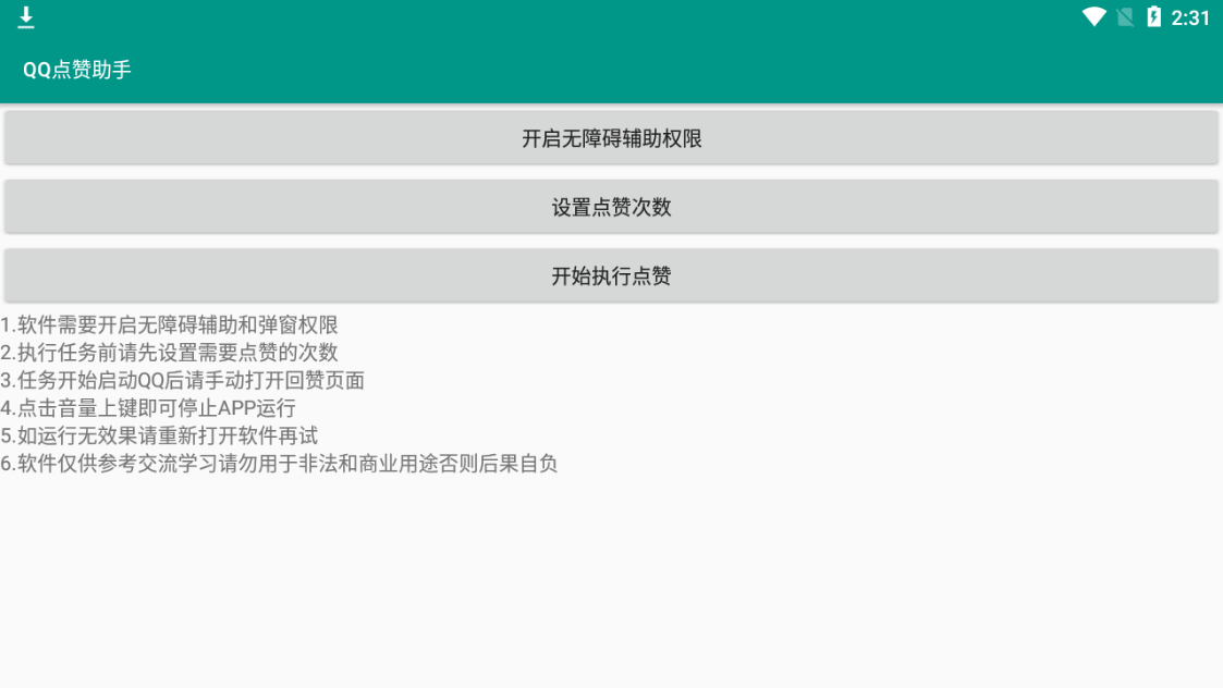 QQ点赞助手是一款专为QQ用户打造的智能点赞工具,能够帮助用户快速提升社交互动体验。这款应用操作简单便捷,只需一键即可实现批量点赞功能,让用户轻松管理社交关系。通过自定义设置点赞次数,用户可以自由控制点赞频率,系统会自动执行任务,整个过程高效省时。在使用前,用户需要开启无障碍服务和弹窗权限,确保软件正常运行。