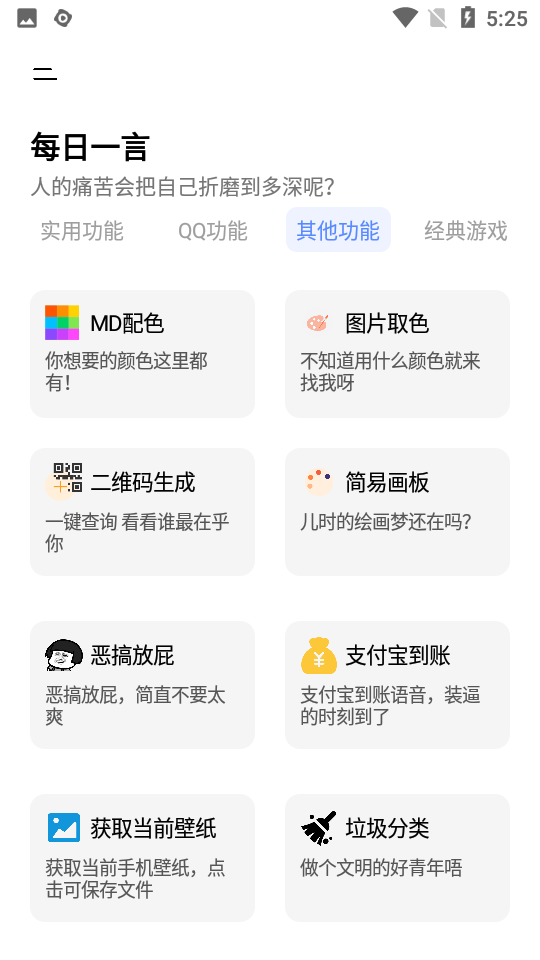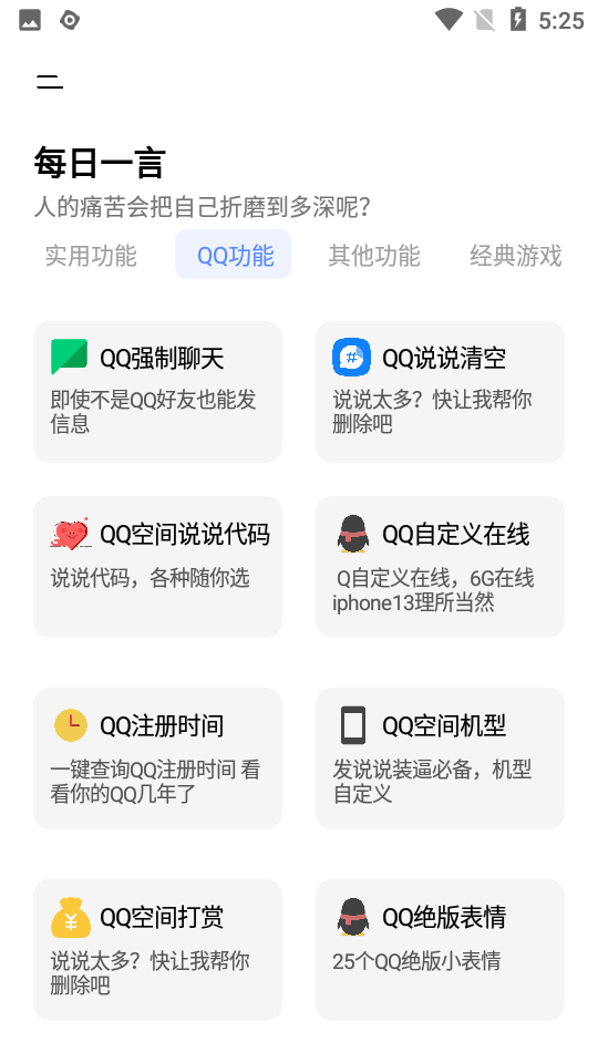 在社交功能方面,奇艺盒子提供了QQ强制功能、QQ说说清空工具、QQ说说代码生成器、QQ自定义在线状态设置、QQ注册时间查询、QQ空间机型修改、QQ空间打赏功能、QQ绝版表情获取、QQ名片反转特效、QQ艾特心形特效等丰富的社交工具。此外,还包含MD配色工具、取色器、二维码生成器、简易画板、宝到账声音设置、手机信息获取、周公解梦查询、家常菜谱等实用功能。