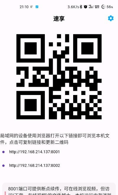 速享采用极简设计风格,界面简洁无广告,让用户能够专注于文件传输本身,无需被繁杂的功能或广告干扰。操作上,软件支持移动端快速选择文件夹传输,用户可直接拖拽文件夹,操作非常便捷实用。无论是传输单个文件还是批量传输,速享都能提供流畅的体验。软件支持多种文件类型的传输,包括音乐、视频、图片、文档等,满足用户多样化的需求。此外,由于是基于局域网传输,速享在文件传输过程中不消耗用户的移动流量,为用户节省了通信费用,特别适合流量有限的用户。