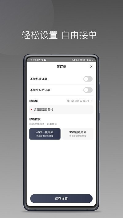 接机预约单功能是乐拼用车的一大特色,系统会智能追踪航班动态,即使遇到航班延误也能及时通知司机,让您能够提前调整接机计划,避免无效等待。此外,软件还持续进行细节优化,致力于为司机师傅们提供更贴心的使用体验。目的地设置功能让您可以轻松匹配返程订单,空车返程成为历史,每次出行都能创造额外收益。