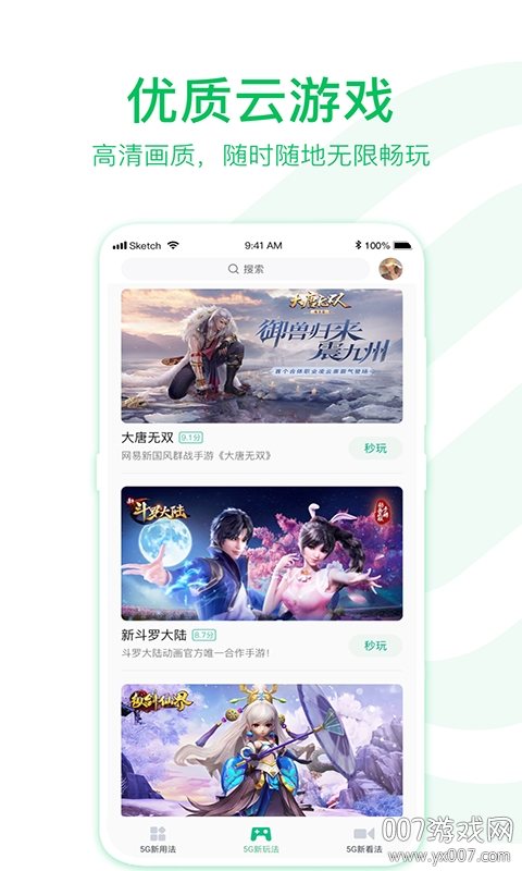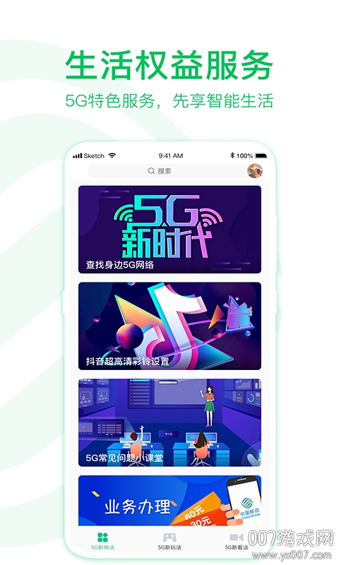 【5G新用法】1、真5G网络来了,快来查询吧;2、免费领取福利(充值话费、流量、会员等)3、提供移动在线5G特色业务办理;4、设置热门超高清;5、浏览移动终端线上商城;6、支持移动自有业务,包括和彩云、139邮箱等;7、咪咕各种;【5G新玩法】1、海量精品单机和主机云无需下载,一键秒完;2、5G玩转手游,吐可吐之槽;3、大量,分享好友一起玩耍4、领取游戏福利大礼包专区【5G新看法】1、丰富的优质超高清4K视频;