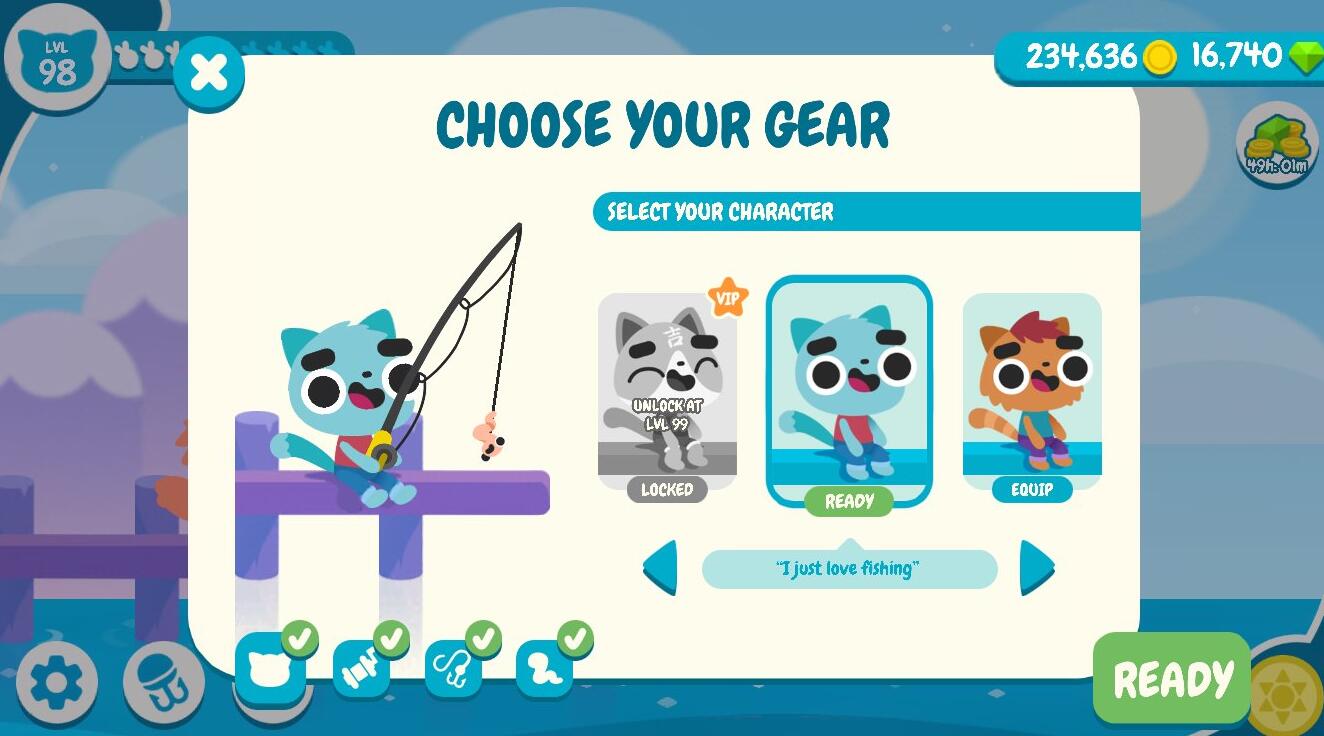 赚取经验,提升等级,解锁道具并完成你的鱼类收藏吧。游戏拥有丰富的成就系统,完成特定任务可以获得稀有奖励。随着等级提升,你将能前往更多特色钓鱼地点。