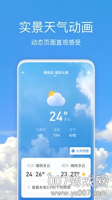 24小时天气预报:全新设计的可视化时间轴界面,直观展示温度、降水、风速等要素的连续变化,支持自定义显示项目。