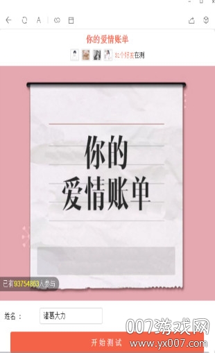 抖音你的爱情账单测试完整版是一款风靡抖音平台的趣味测试小程序,无需复杂操作,只需根据提示完成一系列轻松有趣的测试题,就能探索你与不同人的缘分指数。通过精心设计的问答环节,系统会智能分析你的选择,生成专属爱情成分报告。无论是想了解自己的恋爱特质,还是好奇与某人的匹配度,这款测试都能带来意想不到的发现。简洁的界面和即时的结果反馈,让测试过程充满乐趣,测试结果还能分享给好友,一起讨论爱情中的奇妙化学反应。