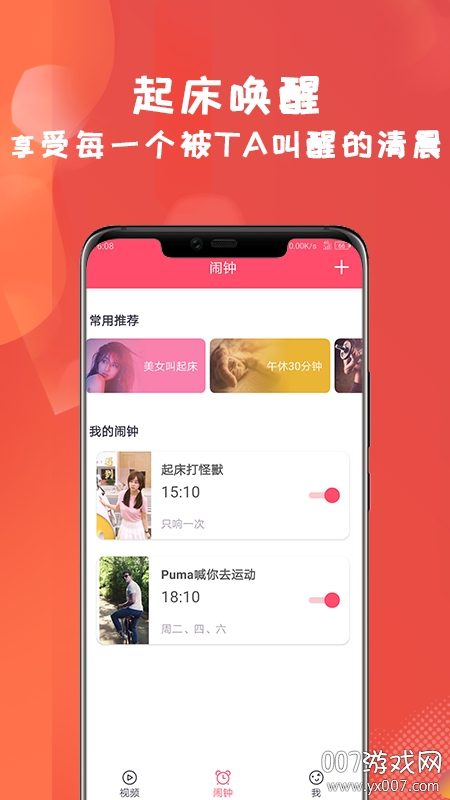 这里有各类经典电影和动漫片段,记忆中的画面加上大师级的配乐,让烦人的起床变得如诗如画以上都不喜欢,你想用自己心上人的视频做闹钟?