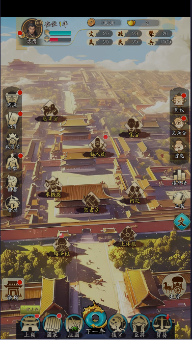 通过精美的画面、优美的以及深刻的情节呈现了中国古代文化和社会生活,御花园中的一草一木都参照《营造法式》制作。故事情节充满了古代官场的风貌,让你仿佛置身于古代朝堂之中,感受的厚重,内阁票拟制度还原了真实的政务流程。与官员们,处理中的各种权力斗争,建立稳固的统治基础,党争系统会随着游戏进度动态演变。自由、发现和利用游戏中的各种资源和关系,提升国家的综合实力,漕运、盐税等经济系统深度模拟明朝财政体系。