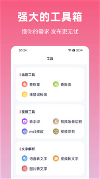 搜搜全网的素材内容,随时下载到本地的手机里面,二次编辑生成个人视频,内置智能去重功能避免素材重复;