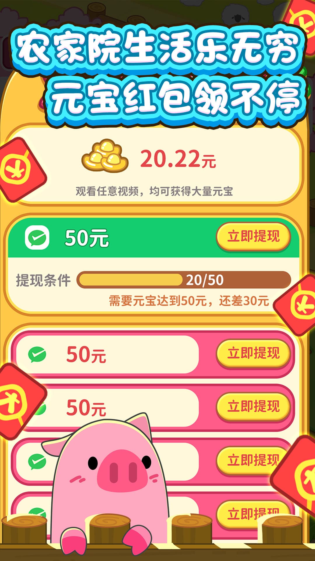 向往的农家院红包版带你走进轻松惬意的田园生活!在这款游戏中,你可以体验种植蔬菜、饲养小动物的乐趣,还能通过日常任务赚取真实红包奖励。游戏画面清新自然,操作简单易上手,无论是种菜收菜还是钓鱼养鸡,都能让你感受到农家生活的悠闲与快乐。每天登录还有额外福利,快来下载体验这款既能放松心情又能赚零花钱的趣味游戏吧!