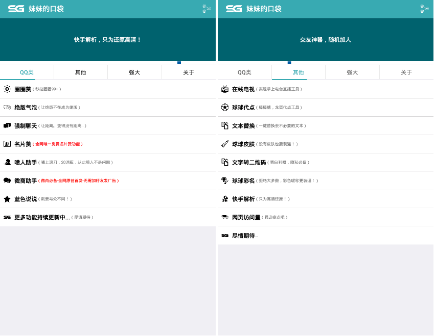 妹妹的口袋app是一款功能丰富的手机应用,专为社交娱乐和游戏爱好者设计。它不仅提供名片点赞、微商辅助工具等实用功能,还能帮助用户轻松管理游戏任务,如球球代领取等。界面简洁易用,操作流畅,适合各类用户群体。无论是想提升社交影响力还是优化游戏体验,这款应用都能满足需求。最重要的是,它完全免费,无需任何付费即可享受全部功能,赶快下载体验吧!