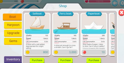 游戏的核心玩法围绕着钓鱼展开,玩家需要使用旋转矛来捕捉各种鱼类,从而赚取金币。随着金币的积累,玩家可以升级船只,解锁更高级的海域,那里栖息着更多稀有鱼类。游戏提供了多样化的矛供玩家选择,每种矛都有独特的属性加成,玩家可以根据自己的游戏风格选择最适合的装备。