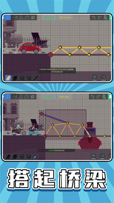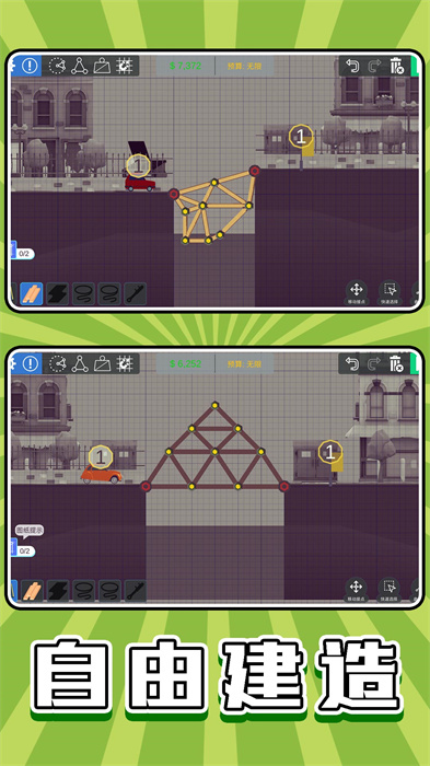 在闯关的过程中玩家还可以通过调整现有桥梁接点的位置使其匹配轮廓图,完成建造任务就可以解锁新的设计方案。随着游戏进程的推进,玩家将接触到更复杂的建筑挑战,包括跨海大桥、高空建筑等特殊场景。每个关卡都经过精心设计,确保玩家能够循序渐进地提升建造技能。