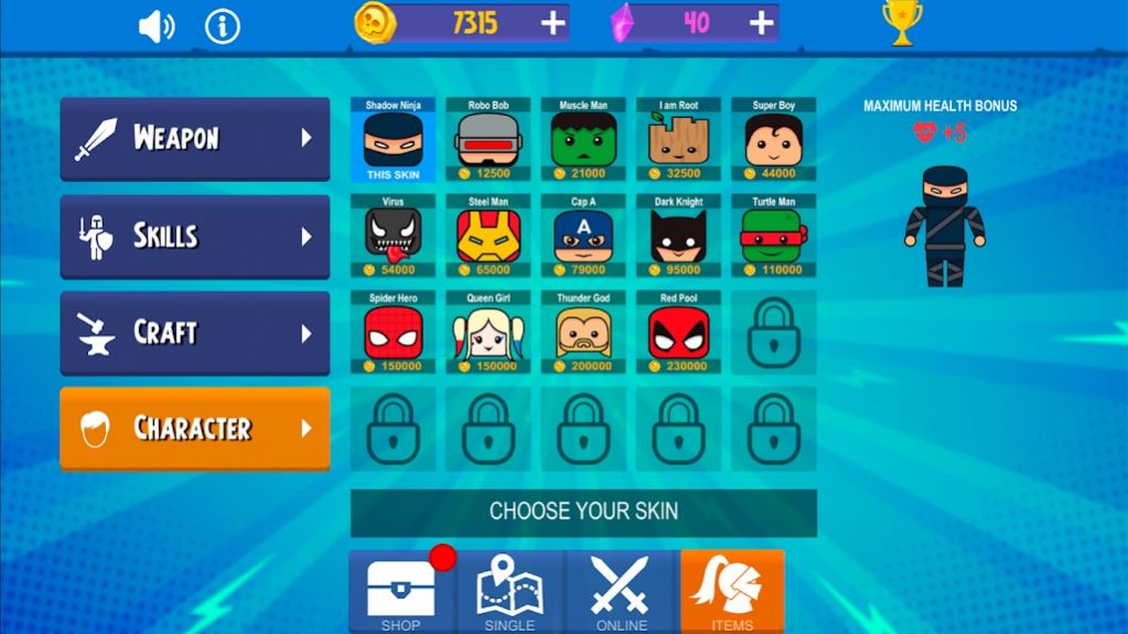 游戏在画质表现上极具特色,像素风格的画面既复古又充满现代感,各种忍者的造型设计炫酷十足,动作流畅自然,打斗场面丝滑不卡顿。游戏的操作方式简单直观,玩家只需通过右侧的虚拟摇杆控制角色移动,点击左侧的攻击按钮即可发动攻击,新手也能快速上手。此外,游戏中还设置了丰富多样的道具系统,包括护盾、血包、伤害增益等,合理使用这些道具可以让你在战斗中事半功倍,更轻松地击败强大的敌人。