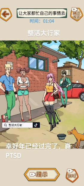 首先注意女孩头发上的小黄鸭装饰,将它交给旁边吐舌头的狗狗会触发特殊互动。面对第一位拄拐杖的老人,需要长按他的银发区域,假发片会突然弹飞露出锃亮光头,这个夸张的动画效果往往让玩家忍俊不禁。接着观察狗狗食盆里的骨头道具,将它交给第二位戴老花镜的奶奶,她会表演一段霹雳舞。打开粉色书包获得关键物品交给第三位穿花衬衫的大爷时,记得留意他背后藏着的荧光棒彩蛋。最后从场景左侧的牛仔裤口袋里摸出车钥匙,交给第四位墨镜大叔会解锁隐藏的摩托车特技表演。