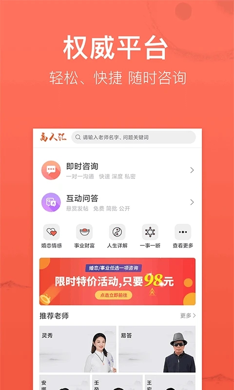 真人大师:平台汇聚了数百位经过严格考核的命理大师,每位都具备专业资质和丰富实战经验;1对1咨询:告别机械化回复,每位用户都能获得专家全程专属服务,确保预测的准确性和针对性;实时沟通:平均10分钟内快速响应,最长提供120小时持续跟踪服务,让您的问题得到彻底解决;隐私保护:采用银行级加密技术,严格保障用户个人信息及咨询内容安全,所有数据均经过脱敏处理,确保您的隐私万无一失。