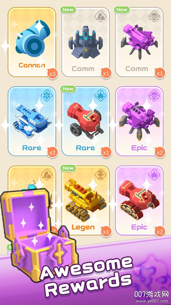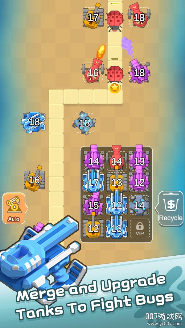 刷足够多的金币用以提升等级,你可以等坦克足够强力后再去敌人。游戏采用独特的资源积累机制,让玩家可以自由选择成长路线。随着游戏的时间增加,你面对的敌人也越来越厉害,将你的坦克合并升级成为更强的坦克。敌人AI会随着游戏进度不断进化。你可以使用强力大炮干掉你的敌人,坦克合并等级越高越厉害哦。高级坦克拥有炫酷的外观和强大的技能特效。