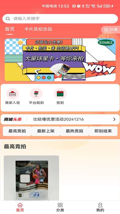 支持手机端使用,方便随时随地参与拍卖活动,利用碎片化时间浏览商品、参与交易。APP还支持消息推送提醒,不错过任何重要的拍卖动态。提供一口价、议价、竞拍三种交易方式,满足不同用户的交易需求,灵活选择购买方式。每种交易方式都配有详细说明和操作指南,确保交易过程顺畅。通过关键字搜索商品,还能根据分类筛选商品,精准定位目标商品,快速找到心仪的卡片及纪念品。高级筛选功能支持按品相、年代、稀有度等多条件筛选。